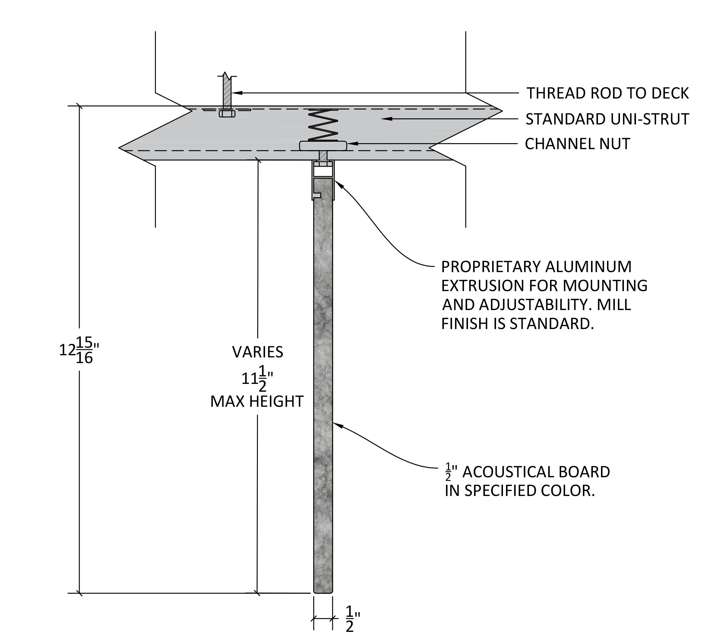 Our standard mounting method is uni-strut as shown in the details on this page however certain designs and situations would be better suited for an aircraft cable suspension which is also available upon request.